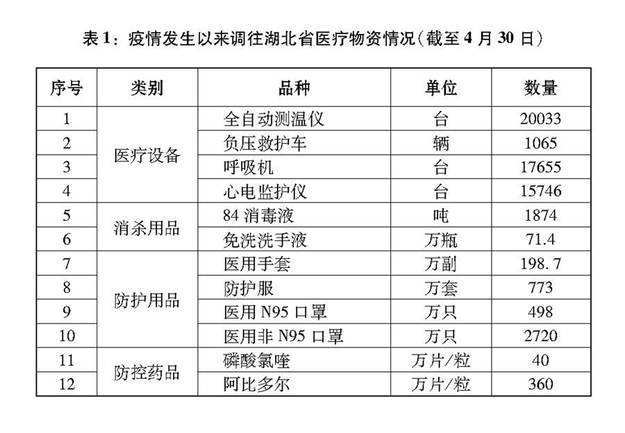 開展新中國成立以來規(guī)模最大的醫(yī)療支援行動。調(diào)動全國醫(yī)療資源和力量,全力支持湖北省和武漢市醫(yī)療救治。自1月24日除夕至3月8日,全國共調(diào)集346支國家醫(yī)療隊、4.26萬名醫(yī)務人員、900多名公共衛(wèi)生人員馳援湖北。19個省份以對口支援、以省包市的方式支援湖北省除武漢市以外16個地市,各省在發(fā)生疫情、防控救治任務十分繁重的情況下,集中優(yōu)質(zhì)醫(yī)療資源支援湖北省和武漢市。人民解放軍派出4000多名醫(yī)務人員支援湖北,承擔火神山醫(yī)院等3家醫(yī)療機構(gòu)的醫(yī)療救治任務,空軍出動運輸機緊急運送醫(yī)療物資。各醫(yī)療隊從接受指令到組建2小時內(nèi)完成,24小時內(nèi)抵達,并自帶7天防護物資,抵達后迅速開展救治。在全國緊急調(diào)配全自動測溫儀、負壓救護車、呼吸機、心電監(jiān)護儀等重點醫(yī)療物資支援湖北省和武漢市(表1)。從全國調(diào)集4萬名建設者和幾千臺機械設備,僅用10天建成有1000張病床的火神山醫(yī)院,僅用12天建成有1600張病床的雷神山醫(yī)院。短短10多天建成16座方艙醫(yī)院,共有1.4萬余張床位。加強臨床血液供應,10個省份無償支援湖北省紅細胞4.5萬單位,血小板1762個治療量,新鮮冰凍血漿137萬毫升(不含恢復期血漿)。大規(guī)模、強有力的醫(yī)療支援行動,有力保障了湖北省和武漢市救治,極大緩解了重災區(qū)醫(yī)療資源嚴重不足的壓力。