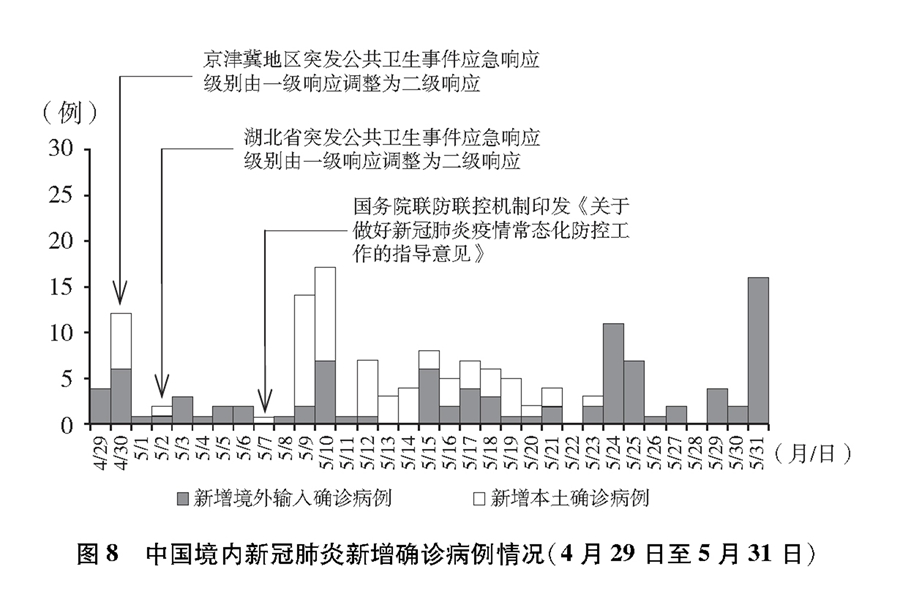 境內(nèi)疫情總體呈零星散發(fā)狀態(tài),局部地區(qū)出現(xiàn)散發(fā)病例引起的聚集性疫情,境外輸入病例基本得到控制,疫情積極向好態(tài)勢持續(xù)鞏固,全國疫情防控進入常態(tài)化。加大力度推進復工復產(chǎn)復學,常態(tài)化防控措施經(jīng)受“五一”假期考驗。經(jīng)中共中央批準,國務院聯(lián)防聯(lián)控機制派出聯(lián)絡組,繼續(xù)加強湖北省疫情防控。(圖8)