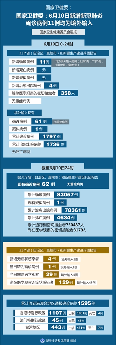 新華社北京6月11日電(記者陳聰)據(jù)國(guó)家衛(wèi)生健康委員會(huì)11日通報(bào),6月10日0-24時(shí),31個(gè)?。ㄗ灾螀^(qū)、直轄市)和新疆生產(chǎn)建設(shè)兵團(tuán)報(bào)告新增新冠肺炎確診病例11例,均為境外輸入病例(上海6例,廣東3例,天津1例,福建1例);無(wú)新增死亡病例;無(wú)新增疑似病例。