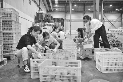 6月18日,湖北省宜昌市夷陵區(qū)電商產(chǎn)業(yè)城工人對網(wǎng)民訂購的橙子進行包裝準備發(fā)貨。張國榮攝/光明圖片