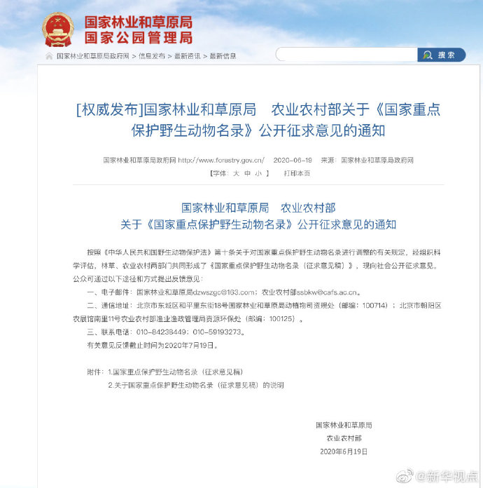 這些調(diào)整你同意嗎?公眾可通過(guò)以下途徑和方式提出反饋意見(jiàn):一、電子郵件:國(guó)家林業(yè)和草原局dzwszgc@163.com;農(nóng)業(yè)農(nóng)村部ssbkw@cafs.ac.cn。二、通信地址:北京市東城區(qū)和平里東街18號(hào)國(guó)家林業(yè)和草原局動(dòng)植物司資規(guī)處(郵編:100714);北京市朝陽(yáng)區(qū)農(nóng)展館南里11號(hào)農(nóng)業(yè)農(nóng)村部漁業(yè)漁政管理局資源環(huán)保處(郵編:100125)。三、聯(lián)系電話(huà):010-84238449;010-59193273。有關(guān)意見(jiàn)反饋截止時(shí)間為2020年7月19日。(記者胡璐)