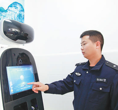 織金縣珠藏鎮(zhèn)警務助理肖發(fā)陽在展示智能機器人如何使用。黃 嫻攝