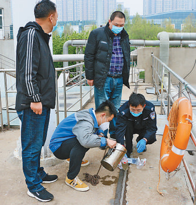 濟南的禁毒民警、禁毒社工在現(xiàn)場采集污水樣品。賈衛(wèi)國攝
