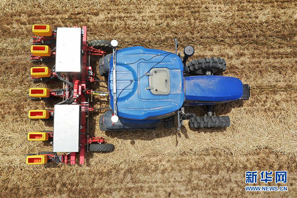 在河南省鄧州市小楊營鎮(zhèn)安眾村,加裝有北斗導(dǎo)航系統(tǒng)的拖拉機(jī)在無人駕駛狀態(tài)下播種(2020年5月26日攝,無人機(jī)照片)。新華社記者馮大鵬攝