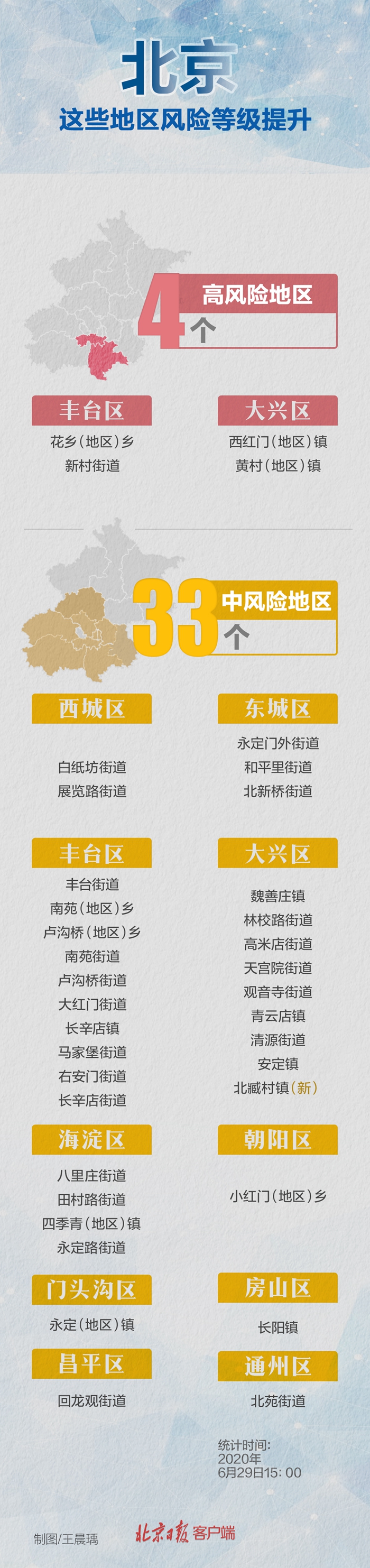 截至目前,本市已有33個中風(fēng)險地區(qū),涉及豐臺區(qū)、大興區(qū)、海淀區(qū)、西城區(qū)、房山區(qū)、東城區(qū)、朝陽區(qū)、門頭溝區(qū)、通州區(qū)、昌平區(qū)10個區(qū)。另有4個高風(fēng)險地區(qū),分別位于豐臺區(qū)、大興區(qū)。