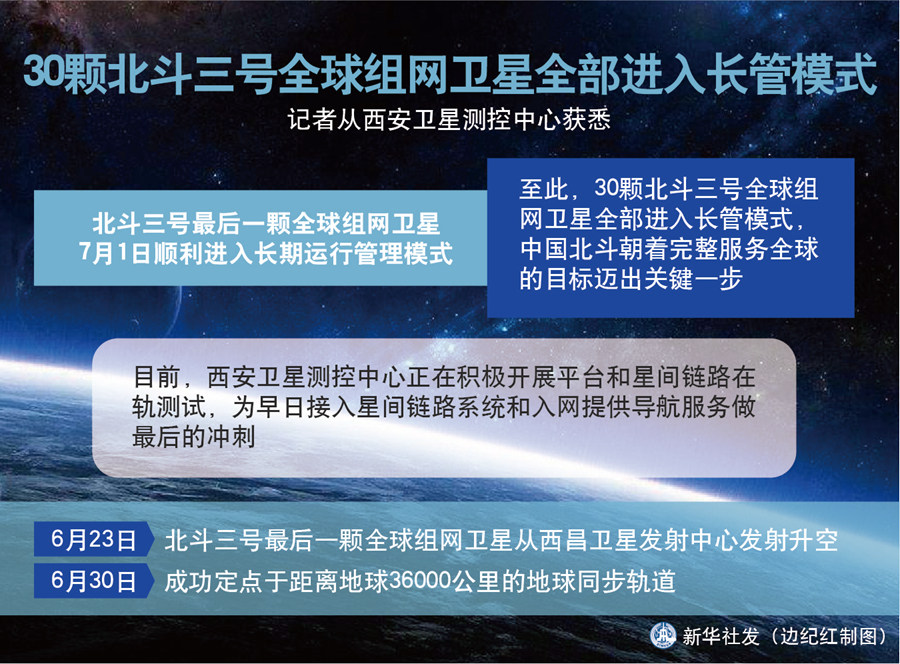 新華社西安7月1日電(李國利、徐新芳)記者從西安衛(wèi)星測控中心獲悉,北斗三號最后一顆全球組網(wǎng)衛(wèi)星1日順利進入長期運行管理模式,至此,30顆北斗三號全球組網(wǎng)衛(wèi)星全部進入長管模式,中國北斗朝著完整服務(wù)全球的目標邁出關(guān)鍵一步。