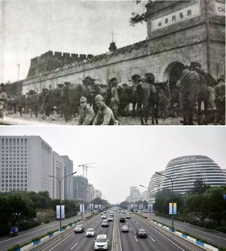上圖為1937年8月8日,日本騎兵在朝陽門車站集結(jié)(資料照片);下圖為2017年7月3日拍攝的朝陽門地區(qū)(新華社記者 張晨霖 攝)。