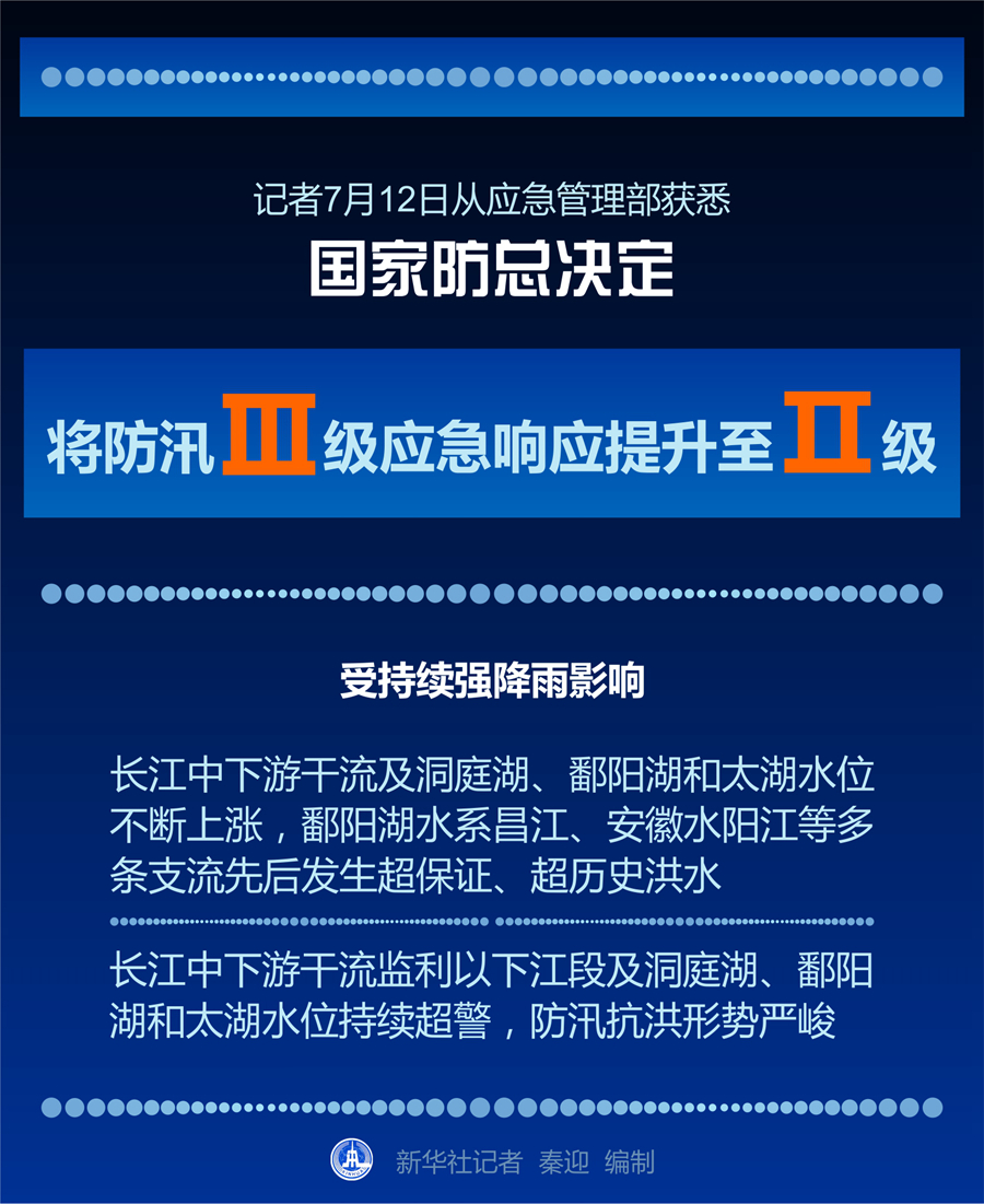 新華社北京7月12日電(記者劉夏村)記者12日從應急管理部獲悉,當日,國家防總決定將防汛Ⅲ級應急響應提升至Ⅱ級。國家防總、應急管理部派出由部級領導帶隊的工作組和專家組趕赴江西等地指導防汛救災工作。
