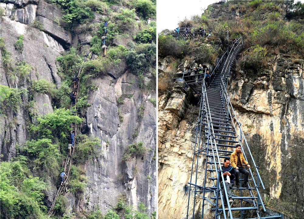 拼版照片:左圖為通往四川涼山彝族自治州昭覺縣阿土列爾村的簡(jiǎn)易藤梯(2016年5月14日攝);右圖為改建后的鋼梯(2017年12月5日攝)。新華社發(fā)(阿克鳩射 攝)