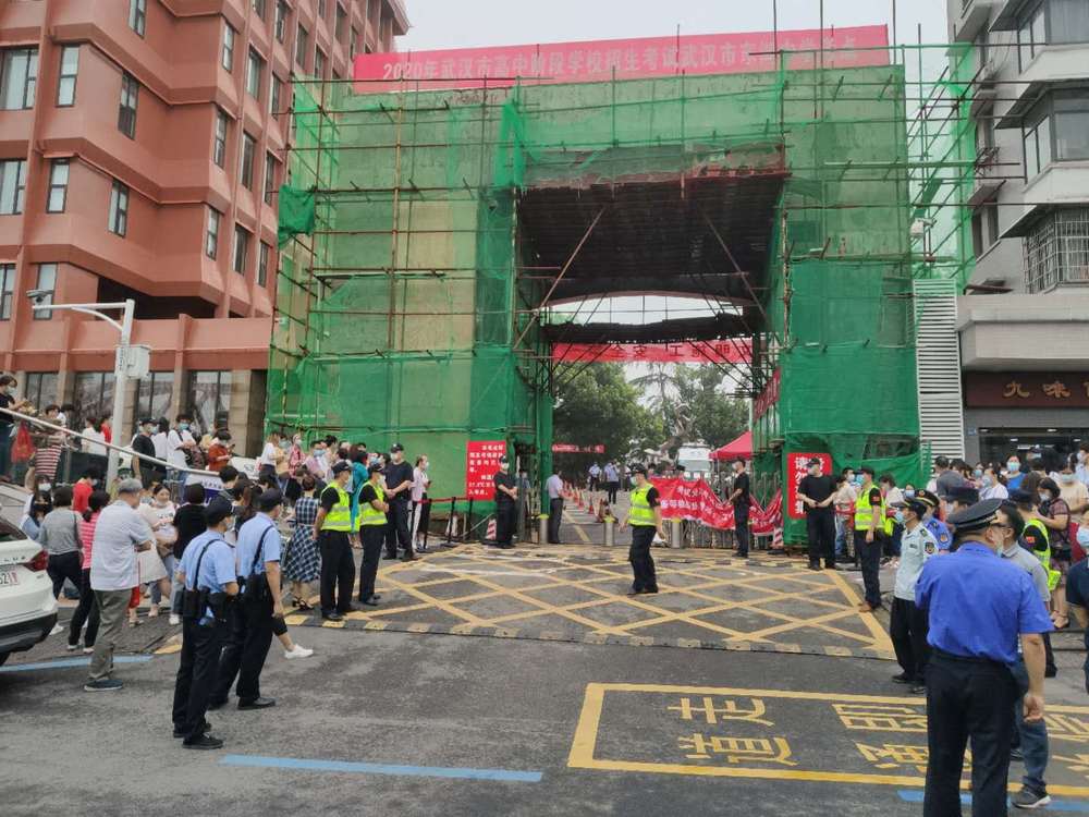 記者在武漢東湖中學考點門前看到,交警、民警、水務、電力、城管等多個部門工作人員嚴陣以待,以高考標準迎接考生進場。