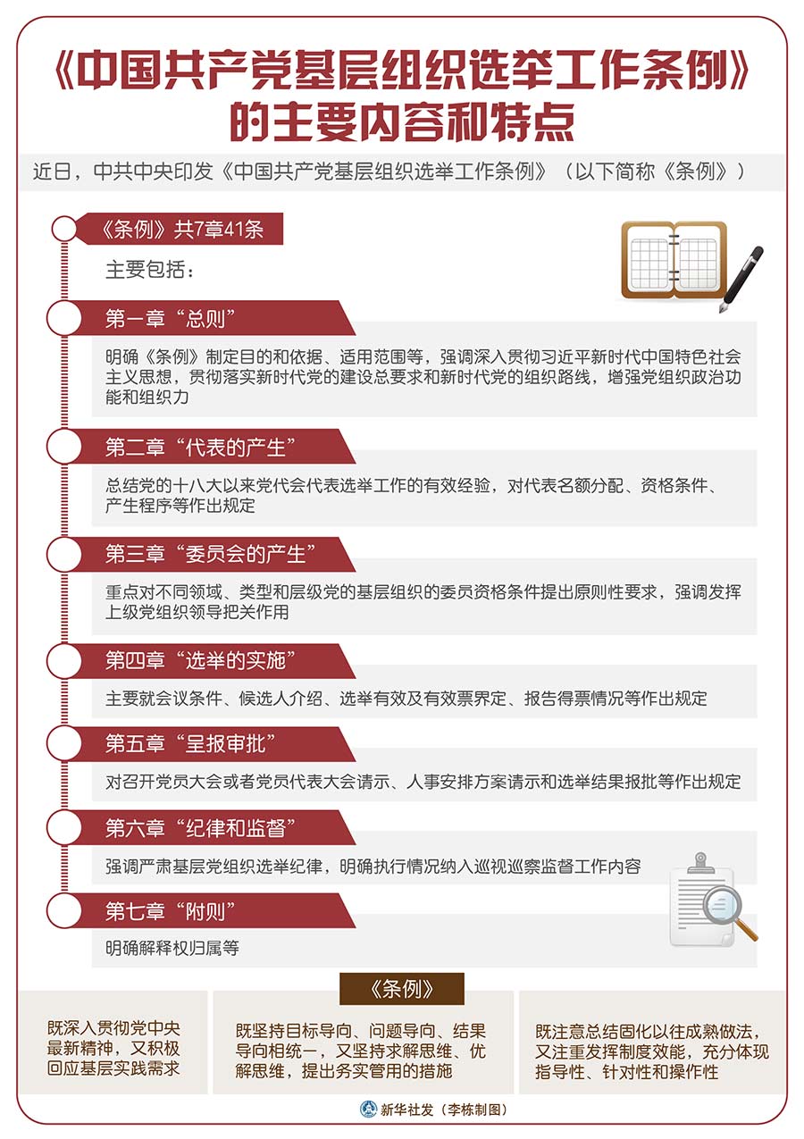 答:《條例》共7章41條,主要包括:第一章“總則”,明確《條例》制定目的和依據、適用范圍等,強調深入貫徹習近平新時代中國特色社會主義思想,貫徹落實新時代黨的建設總要求和新時代黨的組織路線,增強黨組織政治功能和組織力。第二章“代表的產生”,總結黨的十八大以來黨代會代表選舉工作的有效經驗,對代表名額分配、資格條件、產生程序等作出規(guī)定。第三章“委員會的產生”,重點對不同領域、類型和層級黨的基層組織的委員資格條件提出原則性要求,強調發(fā)揮上級黨組織領導把關作用。第四章“選舉的實施”,主要就會議條件、候選人介紹、選舉有效及有效票界定、報告得票情況等作出規(guī)定。第五章“呈報審批”,對召開黨員大會或者黨員代表大會請示、人事安排方案請示和選舉結果報批等作出規(guī)定。第六章“紀律和監(jiān)督”,強調嚴肅基層黨組織選舉紀律,明確執(zhí)行情況納入巡視巡察監(jiān)督工作內容。第七章“附則”,明確解釋權歸屬等。