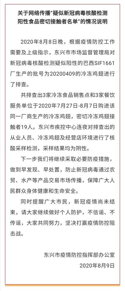 8月9日,記者從東興市疫情防控指揮部辦公室了解到, 8月8日晚,根據(jù)疫情防控工作需要及上級(jí)指示,東興市市場(chǎng)監(jiān)督管理局對(duì)新冠病毒核酸檢測(cè)疑似陽(yáng)性的巴西SIF1661廠生產(chǎn)的批號(hào)為20200409的冷凍雞翅進(jìn)行了排查,共排查出3家冷凍食品銷(xiāo)售點(diǎn)和3家餐飲服務(wù)單位于2020年7月27日—8月7日購(gòu)進(jìn)該同一廠商生產(chǎn)的冷凍雞翅,密切冷凍雞翅接觸者19人。東興市疾控中心連夜對(duì)排查出的從業(yè)人員、冷凍雞翅及經(jīng)營(yíng)店環(huán)境進(jìn)行了核酸采樣檢測(cè),采樣結(jié)果均為陰性。