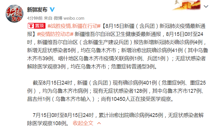 截至8月15日24時,新疆(含兵團)現(xiàn)有確診病例401例(危重癥9例、重癥25例),均為烏魯木齊市病例;現(xiàn)有無癥狀感染者128例,其中烏魯木齊市127例、昌吉州1例(烏魯木齊市輸入);尚有10450人正在接受醫(yī)學(xué)觀察。
