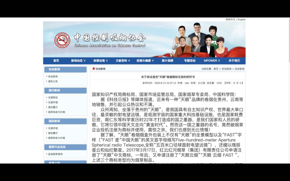 針對“天眼”被煙草企業(yè)注冊商標(biāo)并使用一事,中國控制吸煙協(xié)會8月13日在其官網(wǎng)發(fā)布聲明,希望國家知識產(chǎn)權(quán)局商標(biāo)局等部門對此事予以關(guān)注。