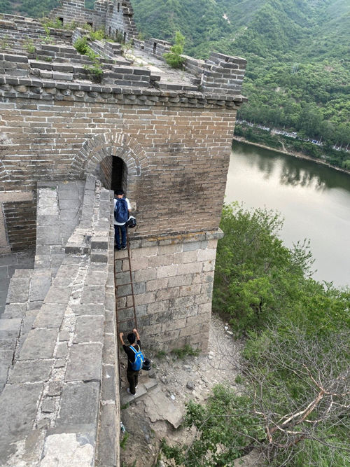 他說,登野長城是不允許的,近年來,北京市文物局也加大了巡查力度,設(shè)置了一些負責(zé)長城環(huán)保的公益志愿者和長城保護工作人員巡山。如果被發(fā)現(xiàn),梯子肯定要被鄉(xiāng)鎮(zhèn)沒收。據(jù)稱,登城所用的梯子就被鄉(xiāng)鎮(zhèn)沒收了3次。為保險起見,他會早晨放梯,晚上再撤掉。
