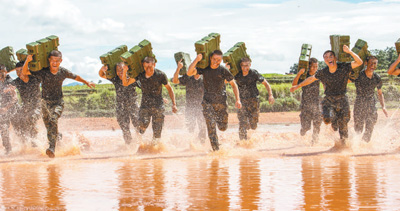 中隊官兵扛著彈藥箱在泥水中訓(xùn)練沖刺。記者 金 歆攝