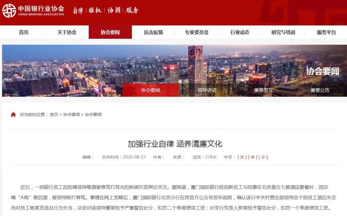 8月24日,廈門國際銀行北京分行發(fā)文證實此事并致歉。該行表示,員工楊某反映的中關(guān)村支行營業(yè)部某領(lǐng)導及該支行個別員工在私下非公款聚餐中,確系存在因酒后失態(tài)而對楊某做出言語及行為失當?shù)扰e動,上述行為確實對其本人造成了影響和傷害,對此深表歉意。