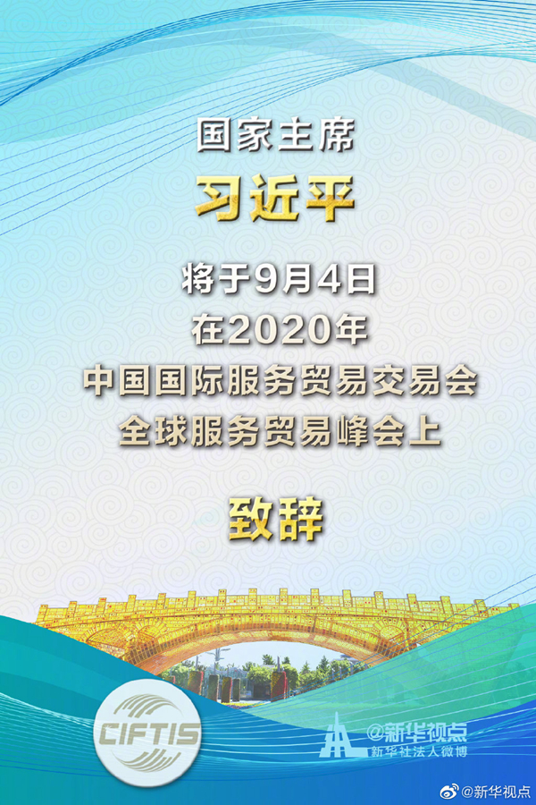 外交部發(fā)言人華春瑩9月3日宣布:2020年中國國際服務貿易交易會全球服務貿易峰會將于9月4日在北京舉行。國家主席習近平將在峰會上致辭。
