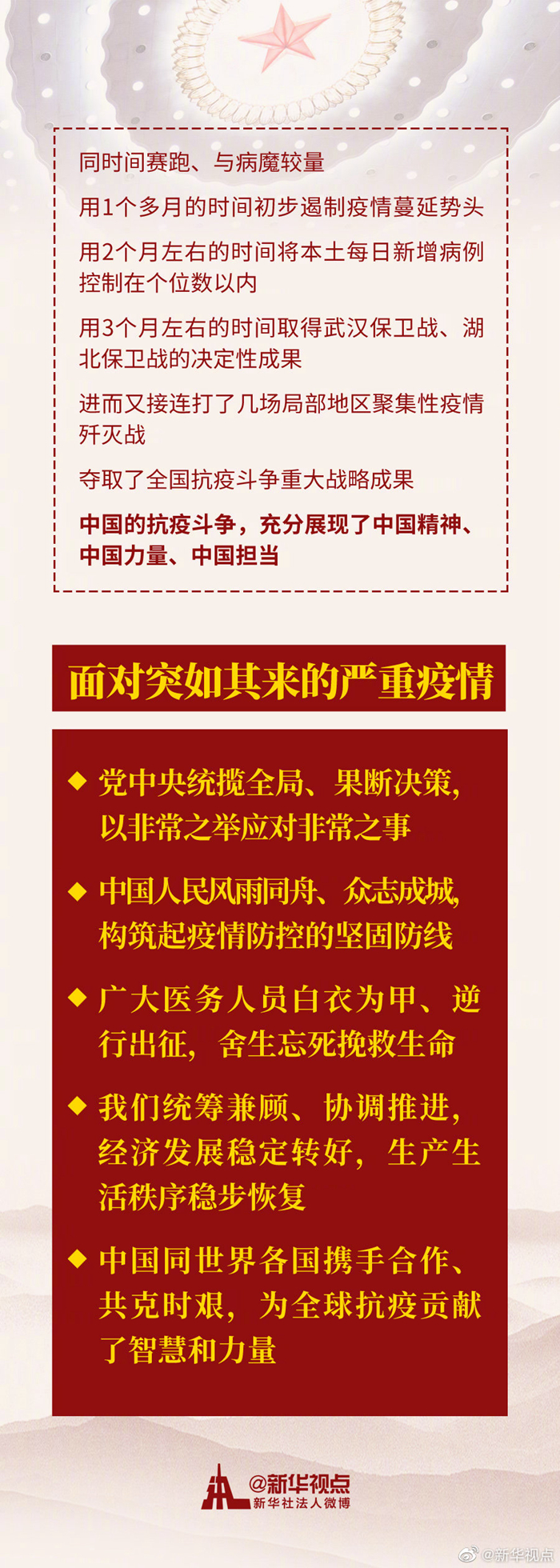 新冠肺炎疫情是百年來全球發(fā)生的最嚴(yán)重的傳染病大流行,是新中國(guó)成立以來我國(guó)遭遇的傳播速度最快、感染范圍最廣、防控難度最大的重大突發(fā)公共衛(wèi)生事件。面對(duì)突如其來的嚴(yán)重疫情,習(xí)近平這樣說↓ ????