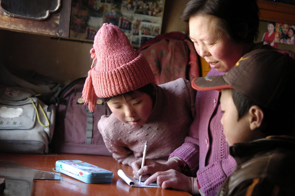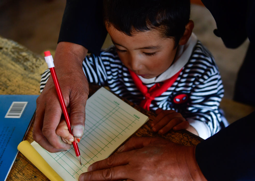 ↑ 2020年8月31日,在青海省海東市循化撒拉族自治縣白莊鎮(zhèn)來塘村學(xué)校,完么仁增老師在指導(dǎo)一年級(jí)學(xué)生馬文輝學(xué)習(xí)。