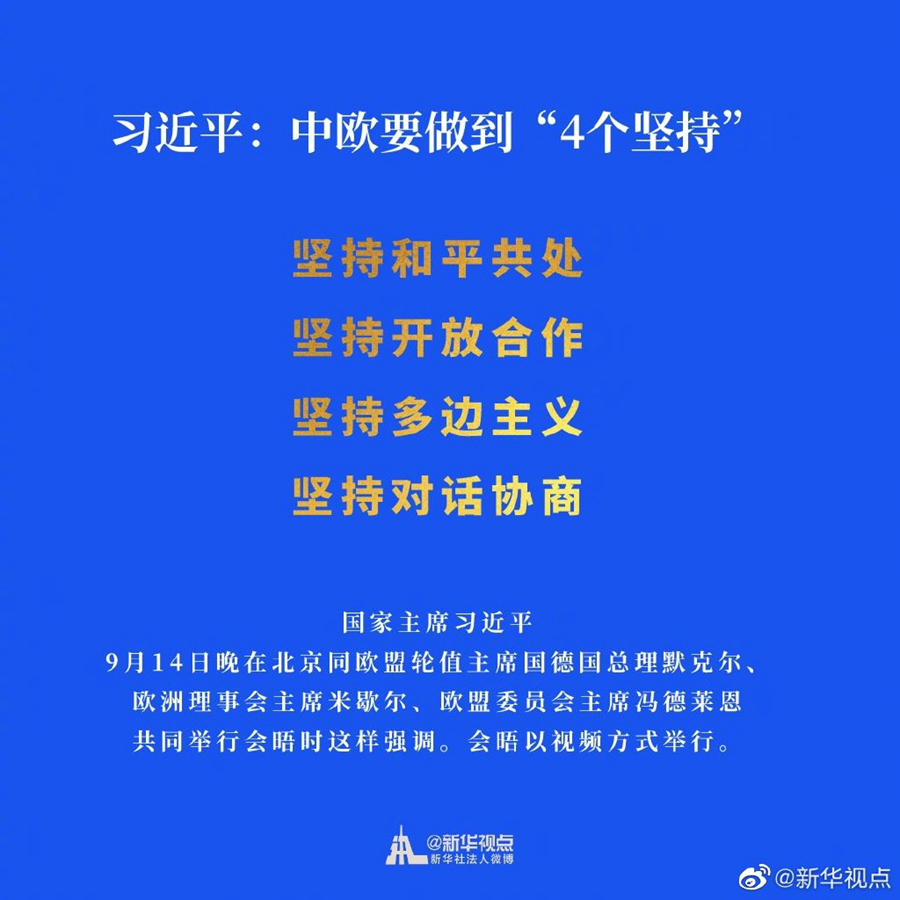 國(guó)家主席習(xí)近平9月14日晚在北京同歐盟輪值主席國(guó)德國(guó)總理默克爾、歐洲理事會(huì)主席米歇爾、歐盟委員會(huì)主席馮德萊恩共同舉行會(huì)晤,會(huì)晤以視頻方式舉行。