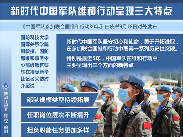 新華社北京9月18日電(記者黎云、張汨汨)《中國軍隊參加聯(lián)合國維和行動30年》白皮書18日對外發(fā)布。國防科技大學國際關系學院副教授、國防部維和事務中心高級教官蔡輝在接受新華社記者采訪時介紹說,新時代中國軍隊堅守初心和使命,勇于開拓進取,在參加聯(lián)合國維和行動中取得一系列歷史性突破。特別是最近5年,中國軍隊在維和行動中主要呈現(xiàn)出三個方面的新特點。
