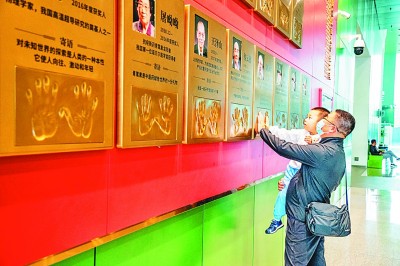 上下圖均為觀眾在中國科技館參觀“國家最高科學技術(shù)獎獲獎科學家手模墻”。中國科技館供圖