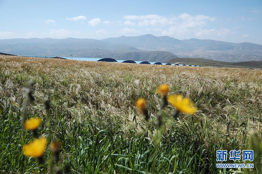東達村的青稞迎來豐收,遠處藍色頂棚建筑是東達村養(yǎng)殖場。新華網記者焦鵬攝