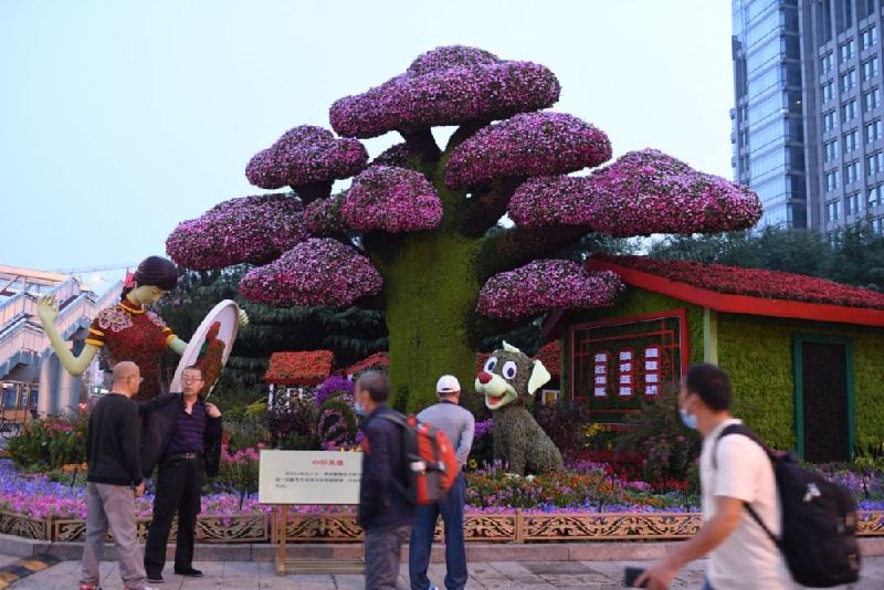 晨曦中,不少早行人在花壇旁駐足觀(guān)賞,拍照留影,提前感受喜慶的節(jié)日氣氛。