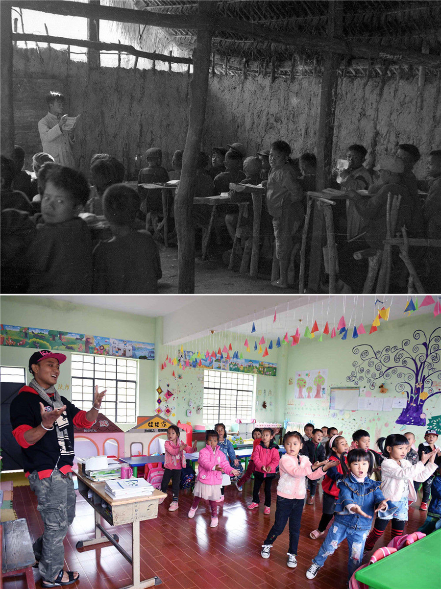 拼版照片:上圖為1954年,在云南省普洱市西盟佤族自治縣創(chuàng)辦的第一所小學——西盟小學,老師帶領孩子讀書學習(資料照片);下圖為2018年12月7日,云南省普洱市西盟佤族自治縣勐梭鎮(zhèn)班母村佤山育忠幼兒園的孩子跟著老師巖科上音樂課。1986年出生的巖科是班母村佤族寨人。他說,我的阿媽小時候沒有進過一天學堂,現(xiàn)在,佤山的孩子們都在寬敞明亮的教室里學習(新華社記者楊宗友攝)。新華社發(fā)