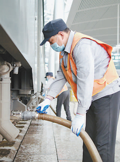 吸污組沿著狹長的車廂線作業(yè),隊(duì)員的耳麥里,不時響起離站時間的提醒。以車廂為界,一側(cè)是匆忙下車的旅客,一側(cè)是緊張作業(yè)的小分隊(duì)。