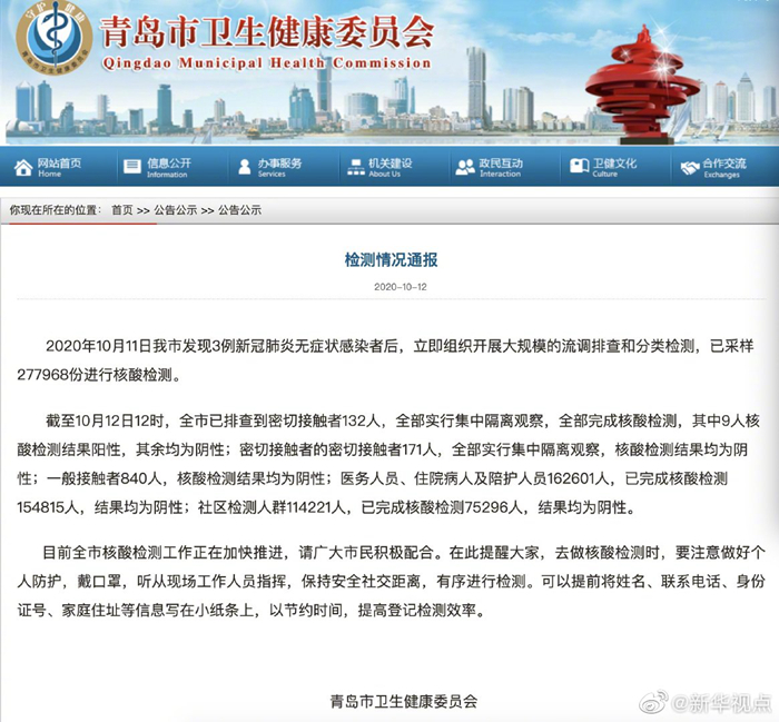 青島市衛(wèi)生健康委員會發(fā)布檢測情況通報稱,2020年10月11日我市發(fā)現(xiàn)3例新冠肺炎無癥狀感染者后,立即組織開展大規(guī)模的流調(diào)排查和分類檢測,已采樣277968份進行核酸檢測。