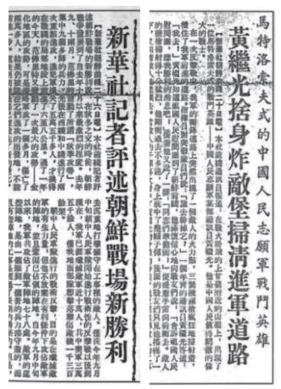 上甘嶺戰(zhàn)役期間,國(guó)內(nèi)報(bào)紙刊登的新華社部分報(bào)道版面。