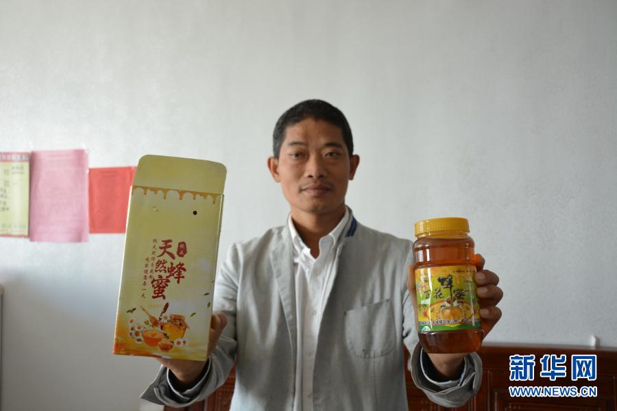 在福建省龍巖市長(zhǎng)汀縣,劉春生在家中展示他養(yǎng)殖的蜜蜂所產(chǎn)蜂蜜(11月11日攝)。新華社記者 張華迎 攝
