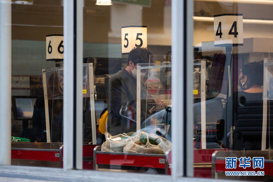 11月12日,在美國紐約一家超市,人們在裝有防護(hù)罩的收銀臺前結(jié)賬。新華社發(fā)(郭克攝)