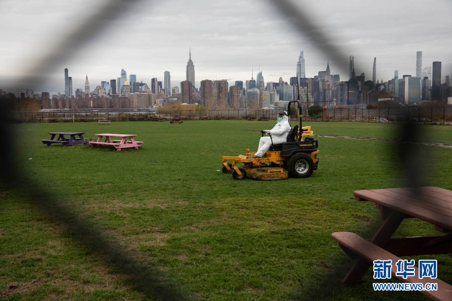 11月12日,在美國紐約一座公園,工人在養(yǎng)護(hù)草坪。新華社發(fā)(郭克攝)