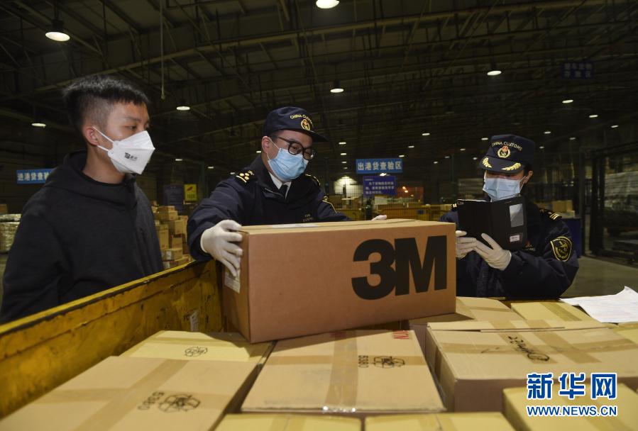 抗擊新冠疫情期間,成都海關(guān)關(guān)員在雙流機(jī)場(chǎng)口岸查驗(yàn)防護(hù)物資,做到即到即提,實(shí)現(xiàn)疫情物資通關(guān)“零延時(shí)”(1月30日攝)。新華社記者 劉坤 攝