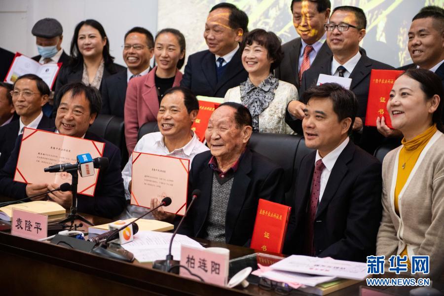 11月13日,在湖南雜交水稻研究中心舉行的“袁隆平農(nóng)業(yè)科技獎(jiǎng)”頒獎(jiǎng)儀式上,袁隆平(前排右三)和獲獎(jiǎng)人員合影。新華社記者 陳思汗 攝