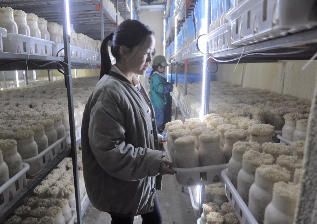 贛州市章貢區(qū)沙石鎮(zhèn)火燃村的貧困戶家庭成員,在扶貧車間低溫環(huán)境下從事蘑菇生產(chǎn),實現(xiàn)就業(yè)脫貧 李傳材 攝