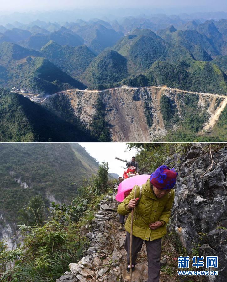 這是一張拼版照片。上圖:已經(jīng)修通水泥路的大化瑤族自治縣板升鄉(xiāng)八好村(2019年11月11日攝,無人機(jī)照片);下圖:在尚未通路前,八好村村民背著年貨走山路回家(2016年1月26日攝)。新華社記者 黃孝邦 攝