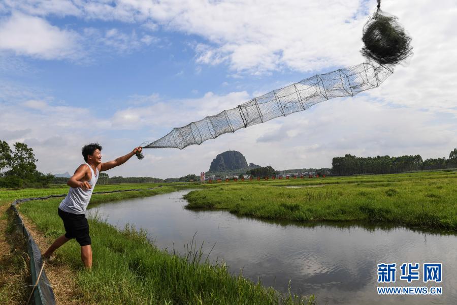 在廣西武宣縣祿新鎮(zhèn)上堂村稻蝦輪作養(yǎng)殖示范基地,村民將捕蝦籠拋入蝦塘中(6月17日攝)。新華社記者 曹祎銘 攝