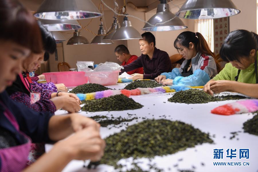 10月27日,在福建省安溪縣感德鎮(zhèn)槐川村的慶蕓茶葉專業(yè)合作社,合作社理事長陳慶云(右三)和工人在分揀鐵觀音茶葉。新華社記者 宋為偉 攝