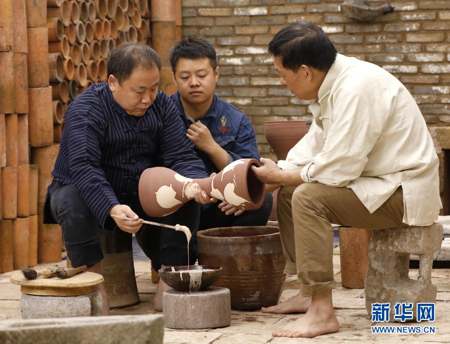 平頂山學院陶瓷學院院長梅國建(右一)指導徒弟為花瓷腰鼓施斑釉(資料照片)。新華社發(fā)