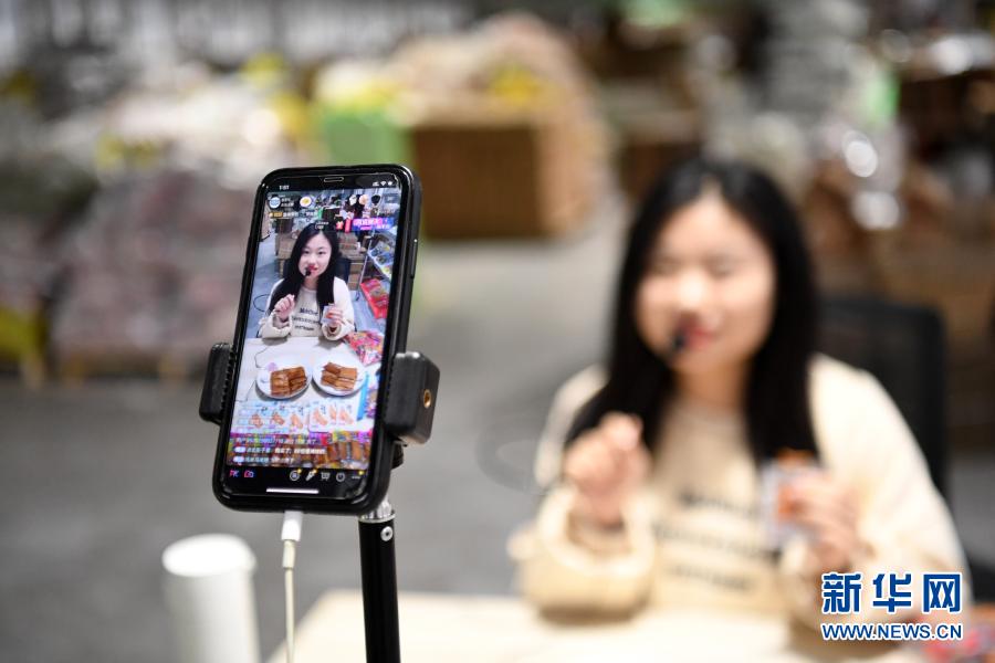 網(wǎng)絡(luò)主播在梁平一家工廠內(nèi)直播推銷傳統(tǒng)豆干(11月18日攝)。新華社記者 唐奕 攝