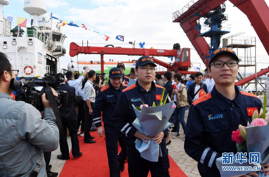 11月28日,在三亞市南山港,“探索一號(hào)”科考船的科考人員下船接受歡迎人群的迎接。新華社記者 趙穎全 攝