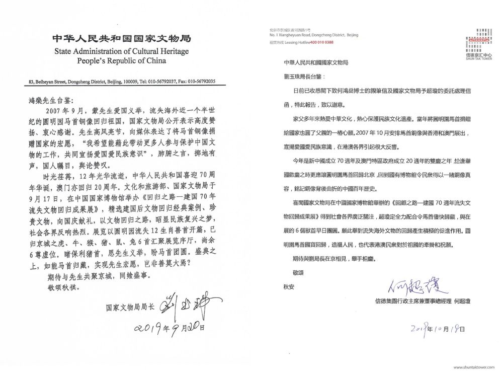 2019年11月,為慶祝中華人民共和國(guó)成立70周年和澳門(mén)回歸20周年,在國(guó)家文物局積極溝通協(xié)調(diào)下,何鴻燊先生決定將圓明園馬首銅像正式捐贈(zèng)國(guó)家文物局。