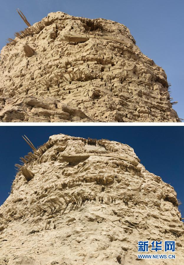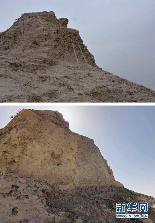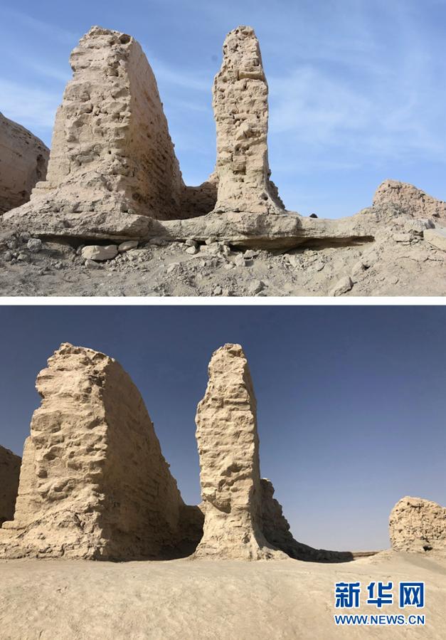 拼版照片:上圖為搶險加固前的三間房遺址局部(2019年11月14日攝);下圖為搶險加固后的三間房遺址局部(10月20日攝)。新華社發(fā)