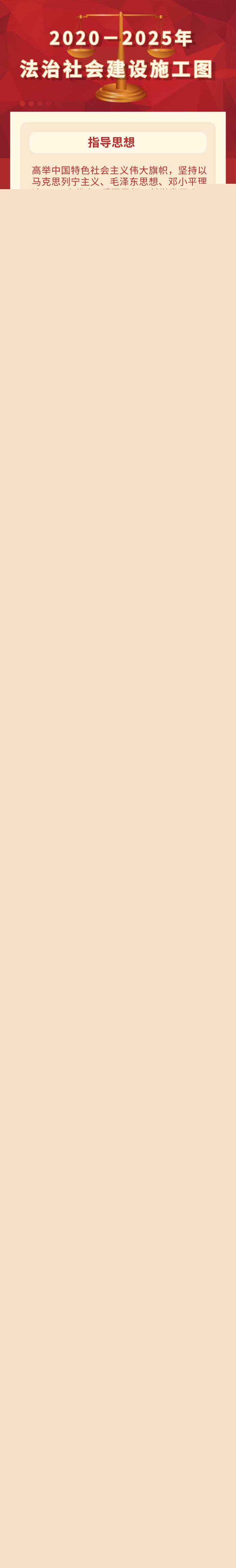 (一)指導(dǎo)思想。高舉中國(guó)特色社會(huì)主義偉大旗幟,堅(jiān)持以馬克思列寧主義、毛澤東思想、鄧小平理論、“三個(gè)代表”重要思想、科學(xué)發(fā)展觀、習(xí)近平新時(shí)代中國(guó)特色社會(huì)主義思想為指導(dǎo),全面貫徹黨的十九大和十九屆二中、三中、四中、五中全會(huì)精神,全面貫徹習(xí)近平法治思想,增強(qiáng)“四個(gè)意識(shí)”、堅(jiān)定“四個(gè)自信”、做到“兩個(gè)維護(hù)”,堅(jiān)定不移走中國(guó)特色社會(huì)主義法治道路,堅(jiān)持法治國(guó)家、法治政府、法治社會(huì)一體建設(shè),培育和踐行社會(huì)主義核心價(jià)值觀,弘揚(yáng)社會(huì)主義法治精神,建設(shè)社會(huì)主義法治文化,增強(qiáng)全社會(huì)厲行法治的積極性和主動(dòng)性,推動(dòng)全社會(huì)尊法學(xué)法守法用法,健全社會(huì)公平正義法治保障制度,保障人民權(quán)利,提高社會(huì)治理法治化水平,為全面建設(shè)社會(huì)主義現(xiàn)代化國(guó)家、實(shí)現(xiàn)中華民族偉大復(fù)興的中國(guó)夢(mèng)筑牢堅(jiān)實(shí)法治基礎(chǔ)。