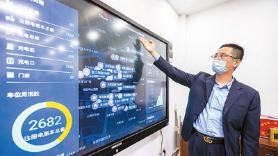 今年以來,上海市靜安區(qū)芷江西路街道對轄區(qū)內的老舊小區(qū)非機動車車庫(棚)進行智能化改造,利用物聯(lián)網(wǎng)技術將車輛相關信息傳遞到小區(qū)物業(yè)公司管理平臺。圖為工作人員介紹非機動車庫管理系統(tǒng)。王 翔攝(新華社發(fā))