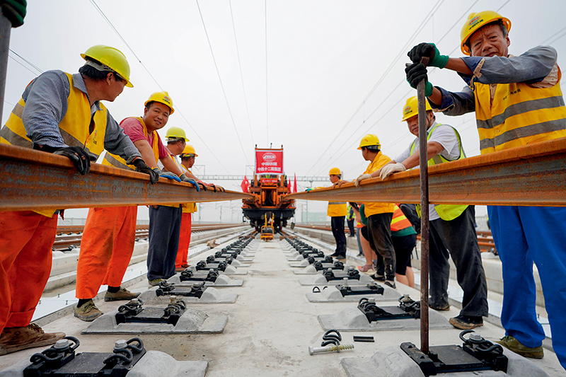 8月17日,中鐵十二局的工人在安裝京雄城際鐵路最后一段鋼軌。當日,京雄城際鐵路全線軌道貫通 邢廣利攝